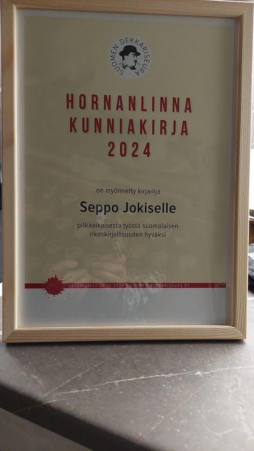 Suomen dekkariseura on myöntänyt erikoispalkintonsa, Hornanlinna-kunniakirjan, kirjailija Seppo Jokiselle tunnustuksena hänen pitkäaikaisesta panoksestaan suomalaisen dekkarikulttuurin kehittämiseen. Tällä kunniakirjalla Dekkariseura haluaa kiittää Jokista hänen pitkästä ja tuotteliaasta urastaan suomalaisessa rikoskirjallisuudessa.