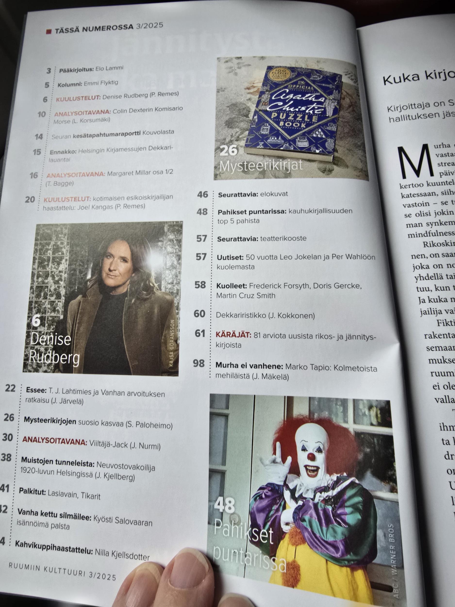 Sata sivua tuhtia luettavaa: analyysia, pohdintaa, haastatteluja, esittelyjä, muistelua ja tiukkaa kritiikkiä. Kaikkea tätä ja paljon muuta jälleen uusimman Dekkariseuran jäsenlehden sivuilla.