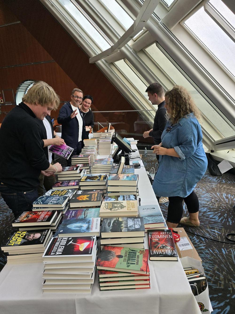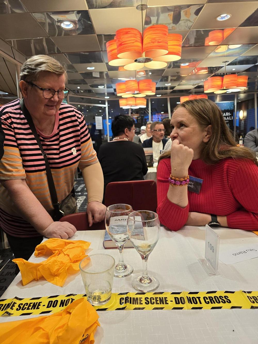 Eckerö Linen M/S Finlandia oli kerännyt laivan täyteen dekkarifaneja. Päivän aikana kuultiin mielenkiintoisia lavakeskusteluja. Kirjamyyntipöydän ääressä sekä illallisella pääsi keskustelemaan kirjailijoiden kanssa. Laivalta tuomisiksi saimme seuraamme uusia jäseniä.
