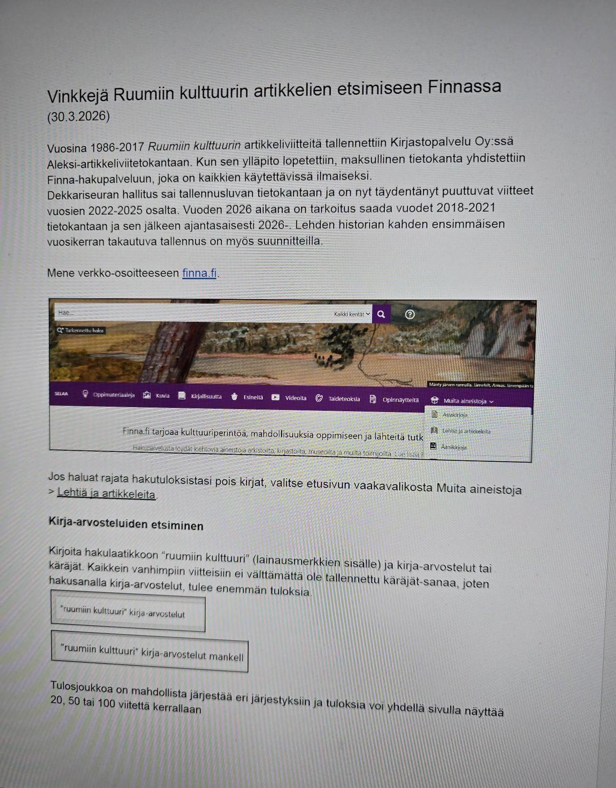 Ruumiin kulttuurin artikkelitietoja Finna.fi -palvelussa
