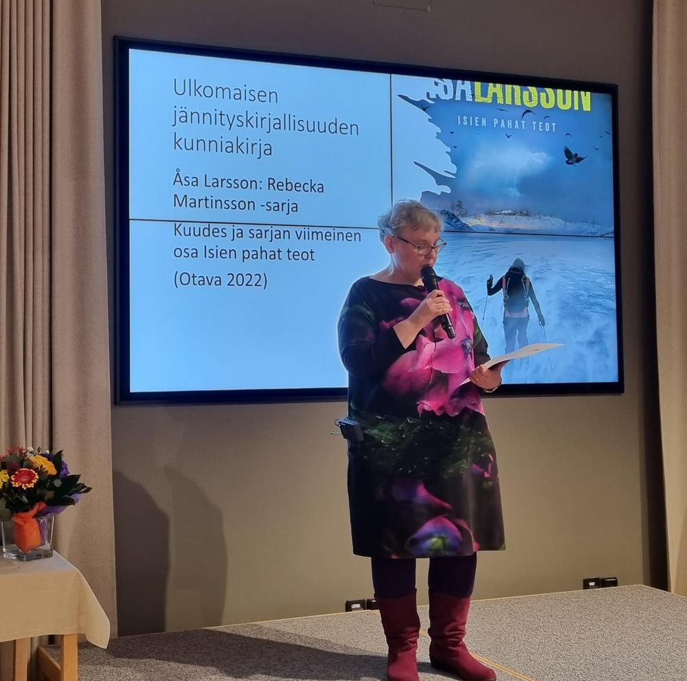 Ote Åsa Larssonin, Ulkomaisen kunniakirjan pokanneen ruotsalaiskirjailijan, kiitostervehdyksestä. Alkuperäinen kiitospuhe näytettiin videotervehdyksenä, jonka jälkeen Leena Korsumäki luki siitä käännöksen, josta tässä siitä ote: