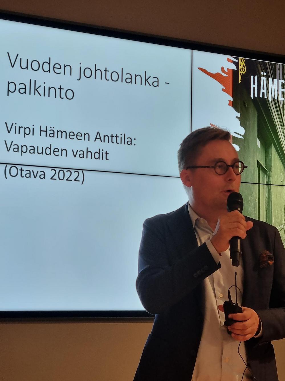 Otavan kaunokirjallisuuden kustannusjohtaja Antti Kasperin kiitossanat Virpi Hämeen-Anttilalle